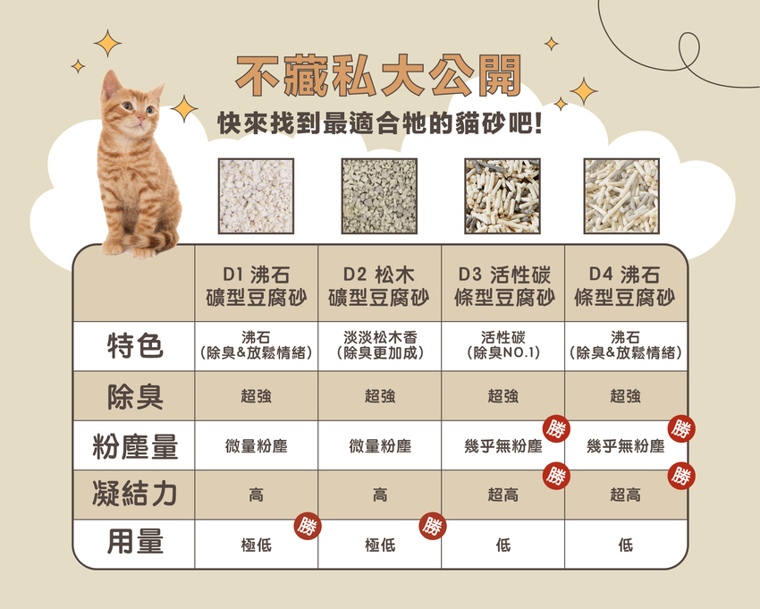 我們的豆腐砂皆具備了低粉塵的特性,若需要最低粉塵量的貓砂,可以參考D3~D5這三款條型豆腐砂”幾乎無粉塵“唷