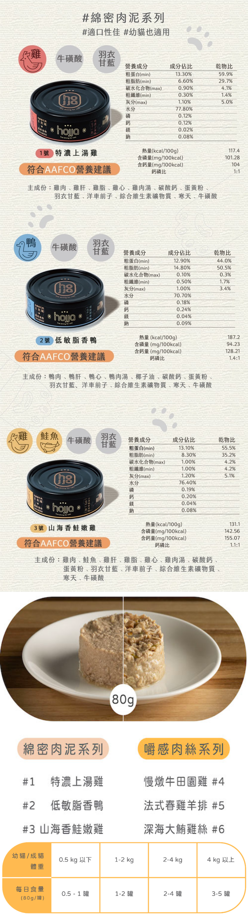 雞肉、雞肝、雞脂、雞心、雞肉湯、碳酸鈣、蛋黃粉、羽衣甘藍、洋車前子、綜合維生素礦物質、寒天、牛磺酸