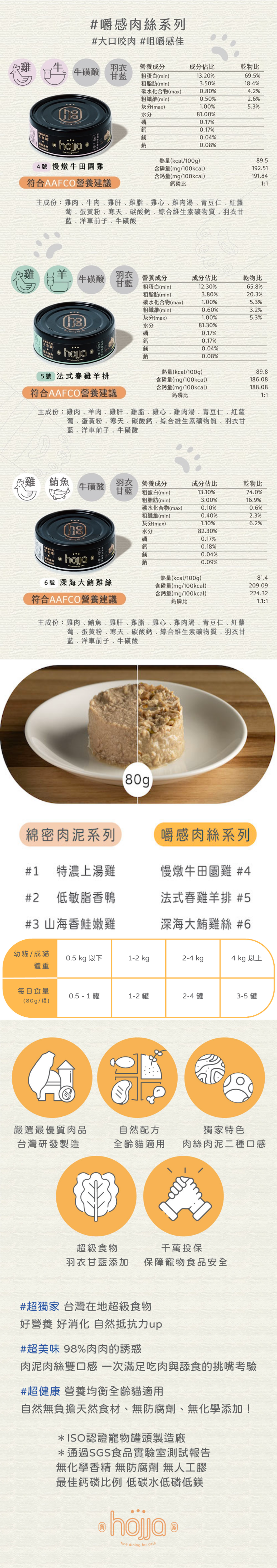 雞肉、鮪魚、雞肝、雞脂、雞心、雞肉湯、青豆仁、紅蘿蔔、蛋黃粉、寒天、綜合維生素礦物質、碳酸鈣、羽衣甘藍、洋車前子、牛磺酸