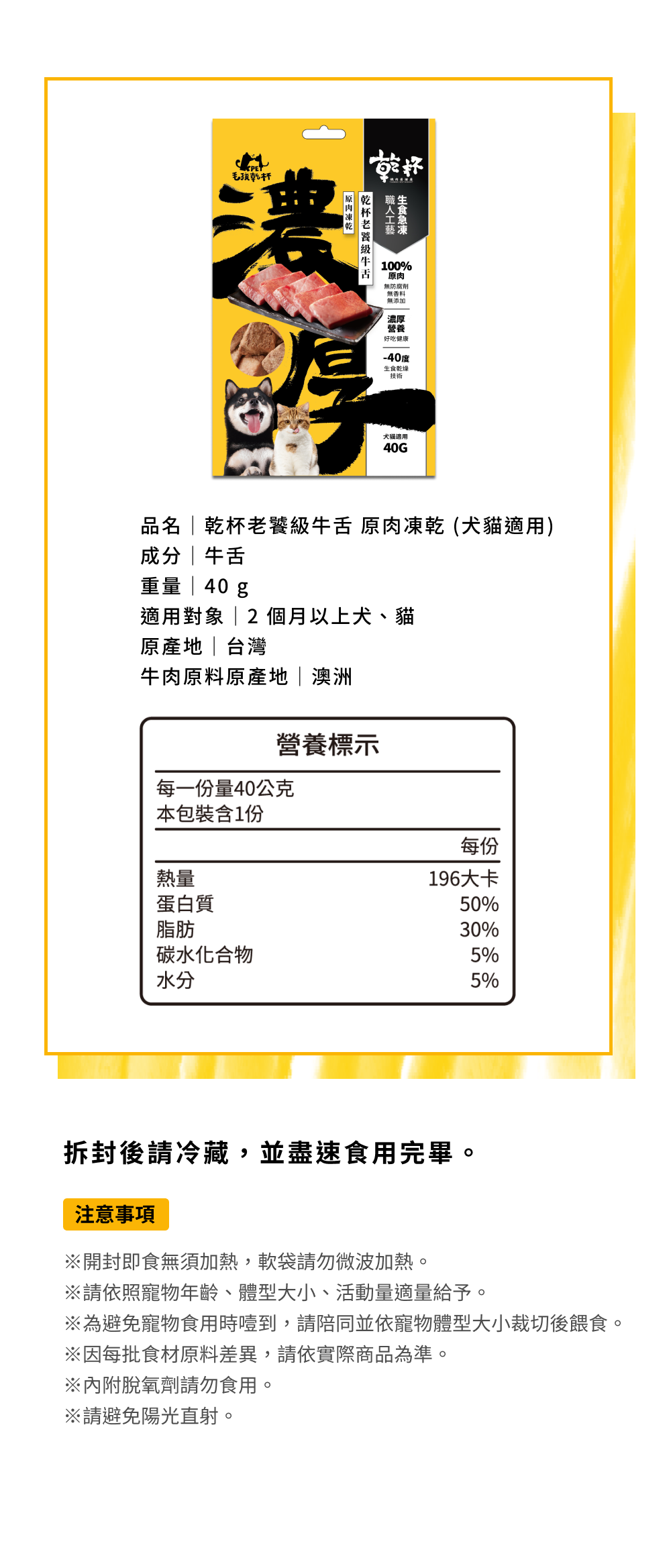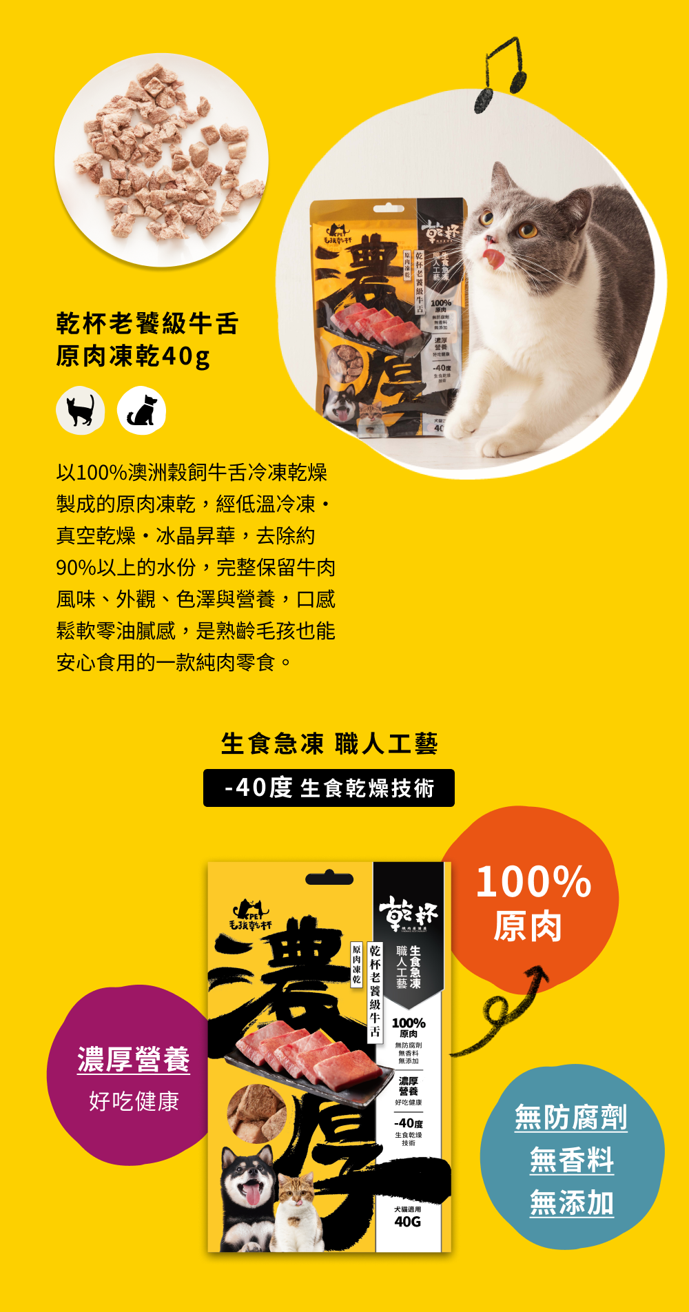 《毛孩乾杯》牛舌原肉凍乾,以100%澳洲穀飼牛舌冷凍乾燥製成的牛舌小凍丁,天然純肉保留食材原型。