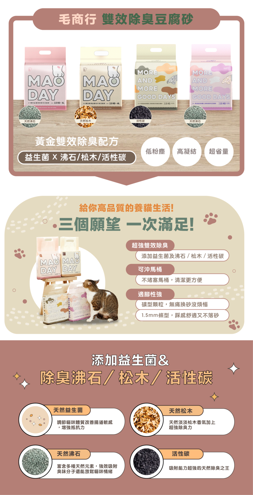 這個系列除臭成分也更升級,100%完全使用活性碳和沸石成份製作再加上原有的益生菌、植物原液,達到四效除臭,是一款除臭升級版的貓砂!