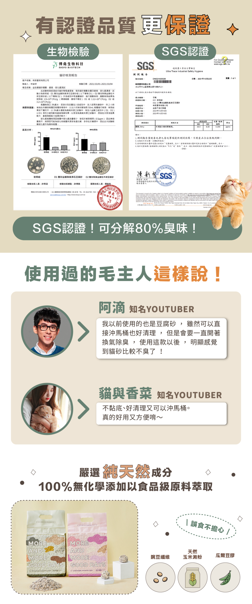 我們的貓砂添加了台灣製造且具有SGS認證的益生菌,可達到5倍的去除氨的效果,比普遍的益生菌還更能抑制住貓尿味喔!
