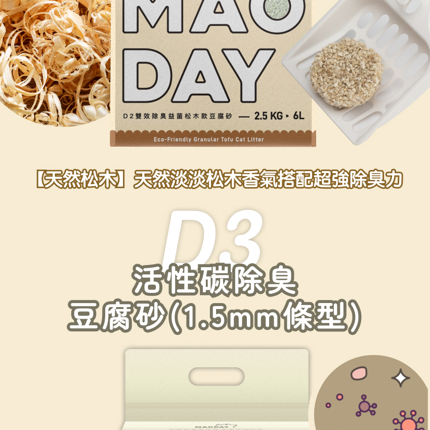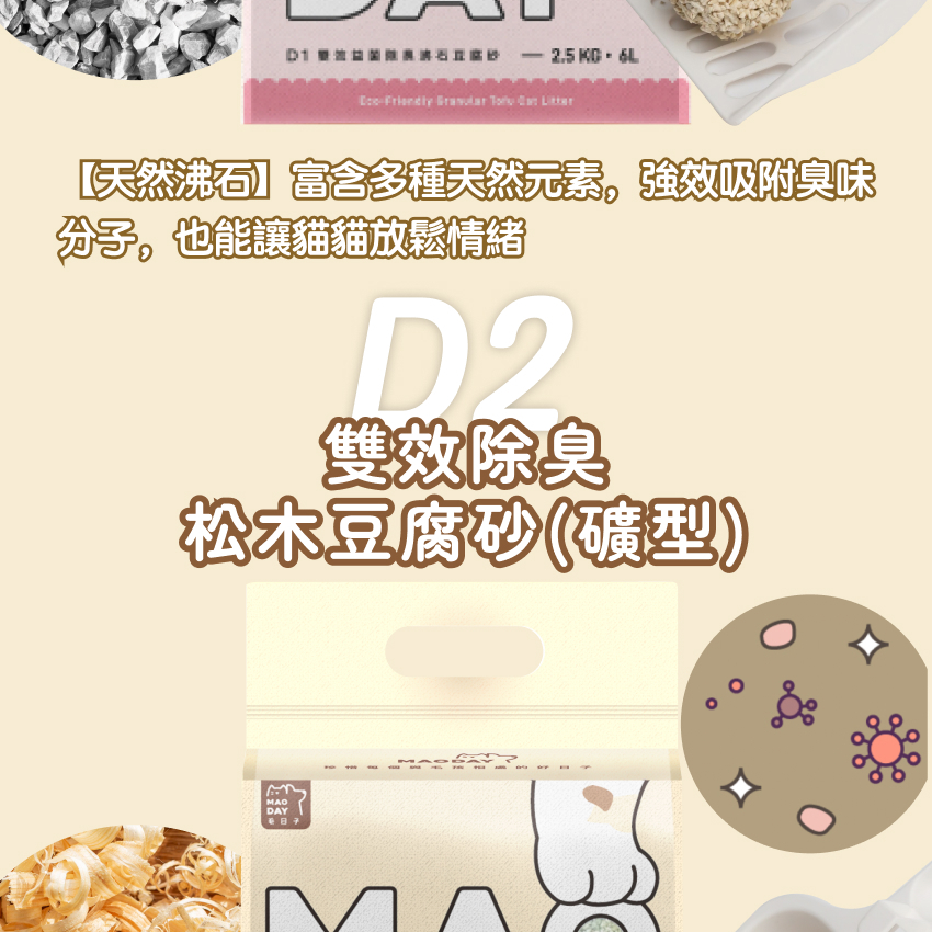 是礦型豆腐砂+松木砂,味道是木質香,各方面的效力都跟D1一樣好!