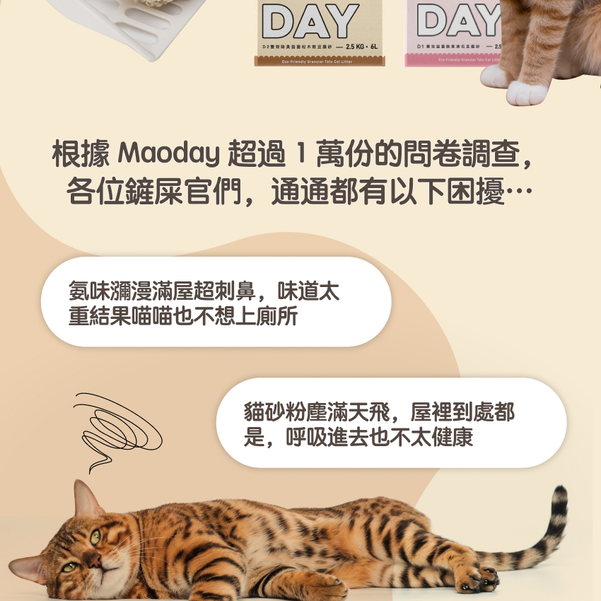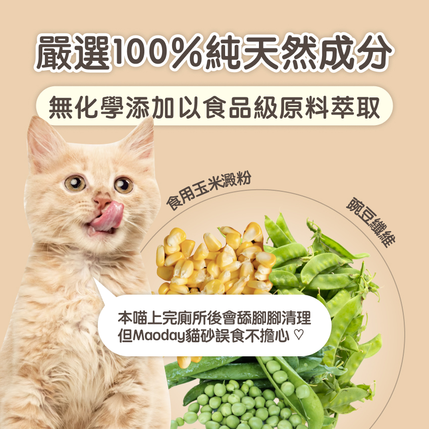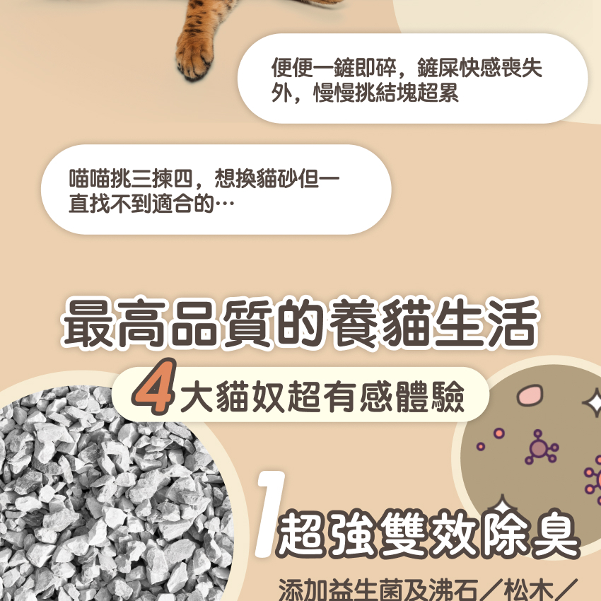 我們的貓砂添加了天然益生菌及天然沸石,具備雙效除臭功效,目前2隻貓貓+兩包貓砂的實測,兩隻貓輪流使用,大約可保持5~6週沒有臭味唷